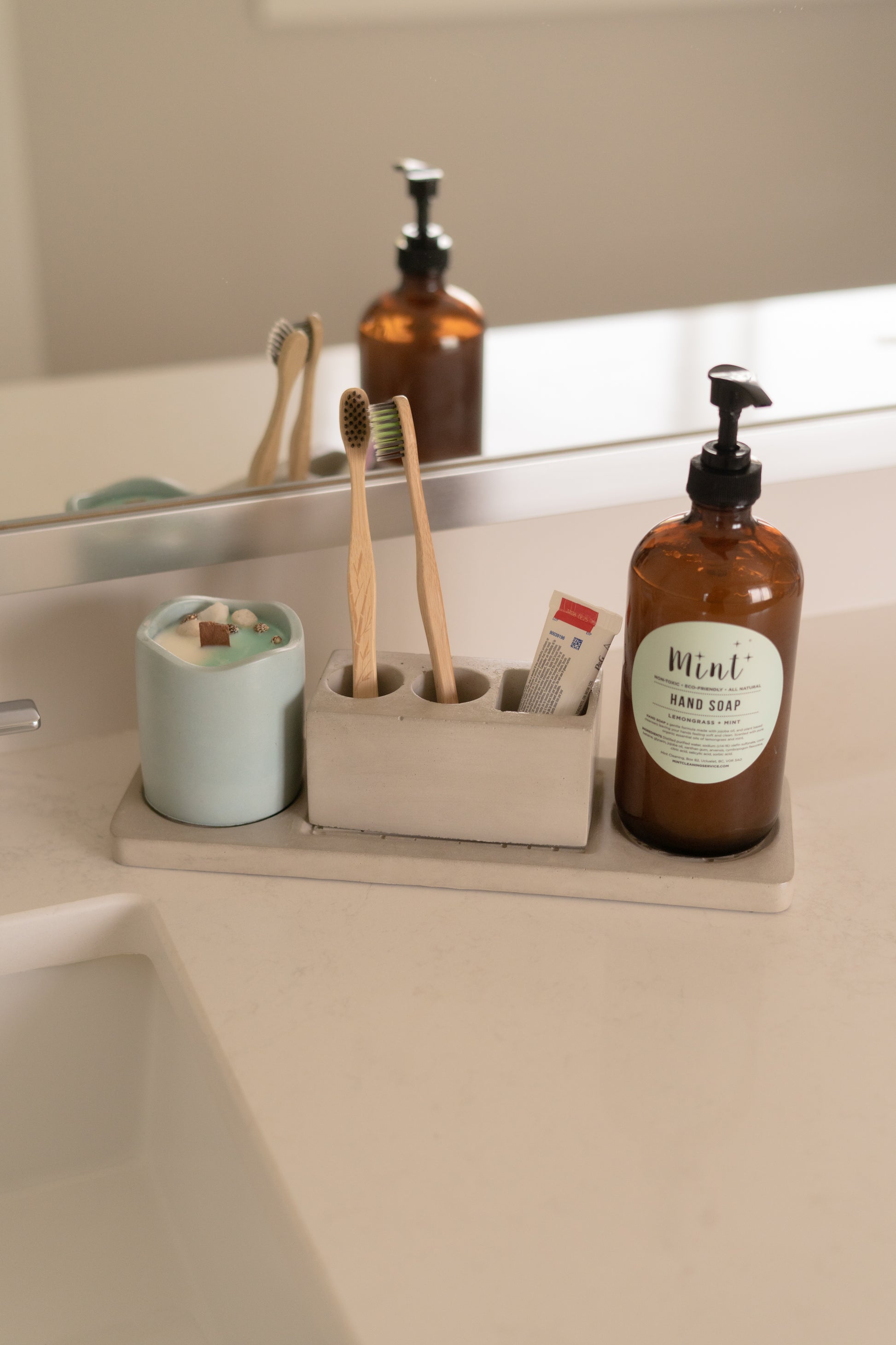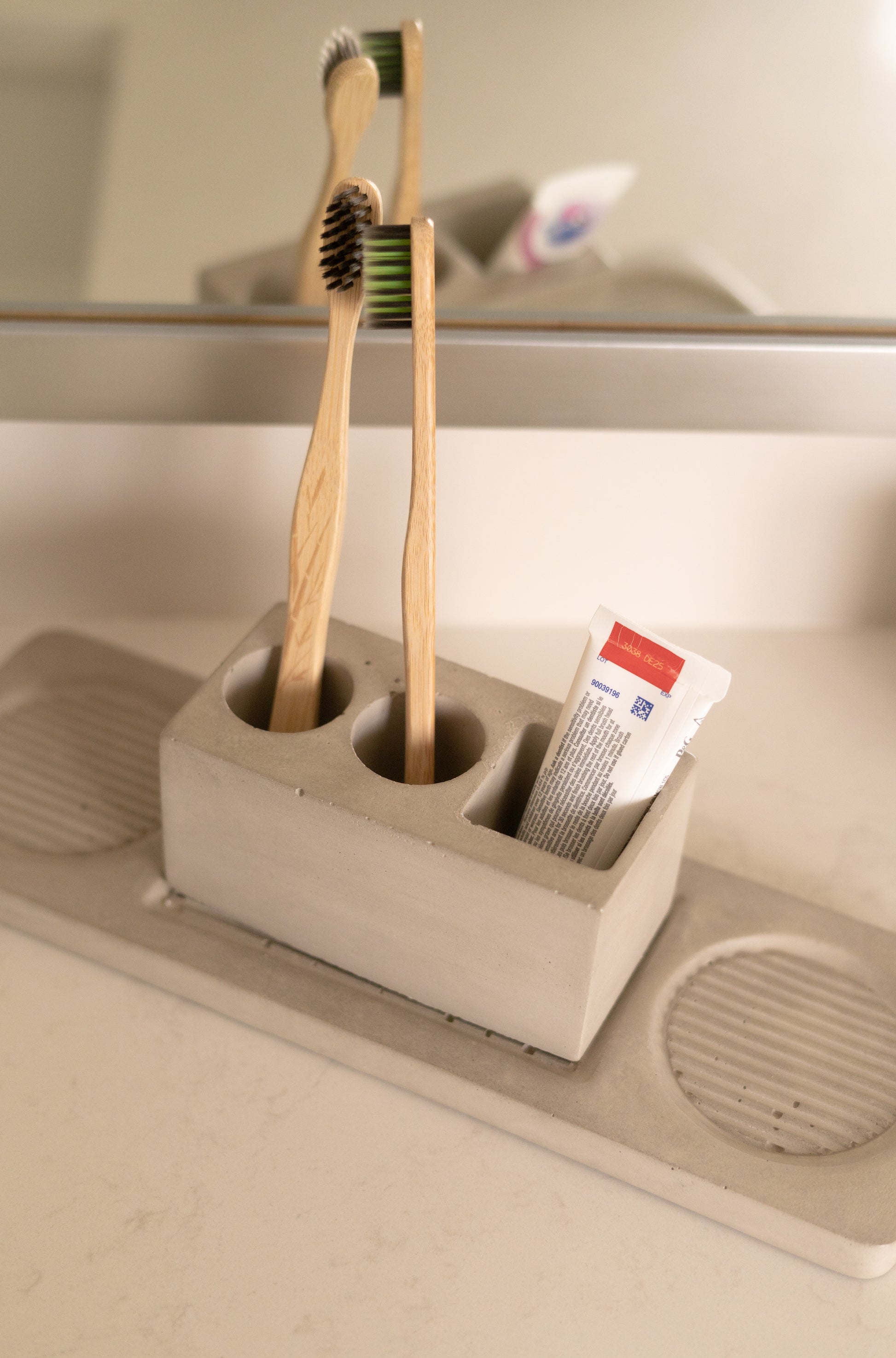 Hold toothbrushes, toothpaste, water cups, and more on this sleek bathroom accessories set.